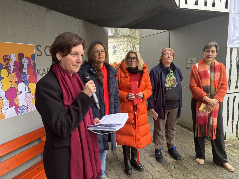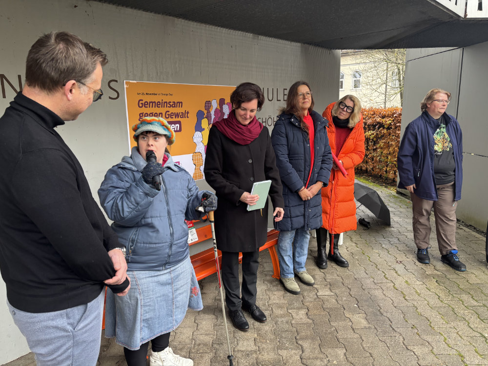 Grußworte sprachen auch Sarah Schwarm, gewählte Frauenbeauftragte der Theo-Lorch-Werkstätten gGmbH, Kristina Wolff und Cynthia Schönau, Gleichstellungsbeauftragte von Stadt und Landkreis, und Diana Hassel, Frauenbeauftragte der Stuttgarter Neckartalwerkstätten. „Uns eint das Bewusstsein, dass Gewalt gegen Mädchen und Frauen eine globale Menschenrechtsverletzung ist, die nicht vor Ludwigsburg Halt macht. Gewalt hindert Frauen und Mädchen daran, ihr Potential voll auszuschöpfen. Sie wirkt sich auf die gesamte Gesellschaft aus, mit enormen sozialen und wirtschaftlichen Kosten und generationsübergreifenden Auswirkungen auf Kinder“, so Kristina Wolff. „Im Landkreis Ludwigsburg nahm Partnerschaftsgewalt um mehr als 37 Prozent zu im Jahresverlauf von 2023 zu 2024“, ergänzte Cynthia Schönau. “Der Orange Day soll uns Jahr um Jahr daran erinnern, dass die eklatanten Menschenrechtsverletzungen gegen Mädchen und Frauen nicht hinnehmbar sind.“