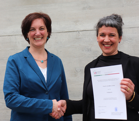 "Wir freuen uns, dass Frau Professorin Lohner unsere Hochschule mit ihrer fachlichen Expertise bereichern wird", sagt Prof. Andrea Dietzsch, Rektorin der EH Ludwigsburg und übergibt Frau Eva Maria Lohner die Ernennungsurkunde zur Professur an der Evangelischen Hochschule Ludwigsburg. Die Evangelische Hochschule Ludwigsburg begrüßt Frau Dr. Eva Maria Lohner zum Sommersemester 2025 als Professorin für Psychosoziale Beratung. "Es war ein spannender Prozess bis hin zur Professur", sagt Professorin Lohner über ihren Werdegang. Ihre wissenschaftliche Erfahrung und ihr Fachwissen trägt zur Weiterentwicklung von Forschung und Lehre an der Hochschule bei.