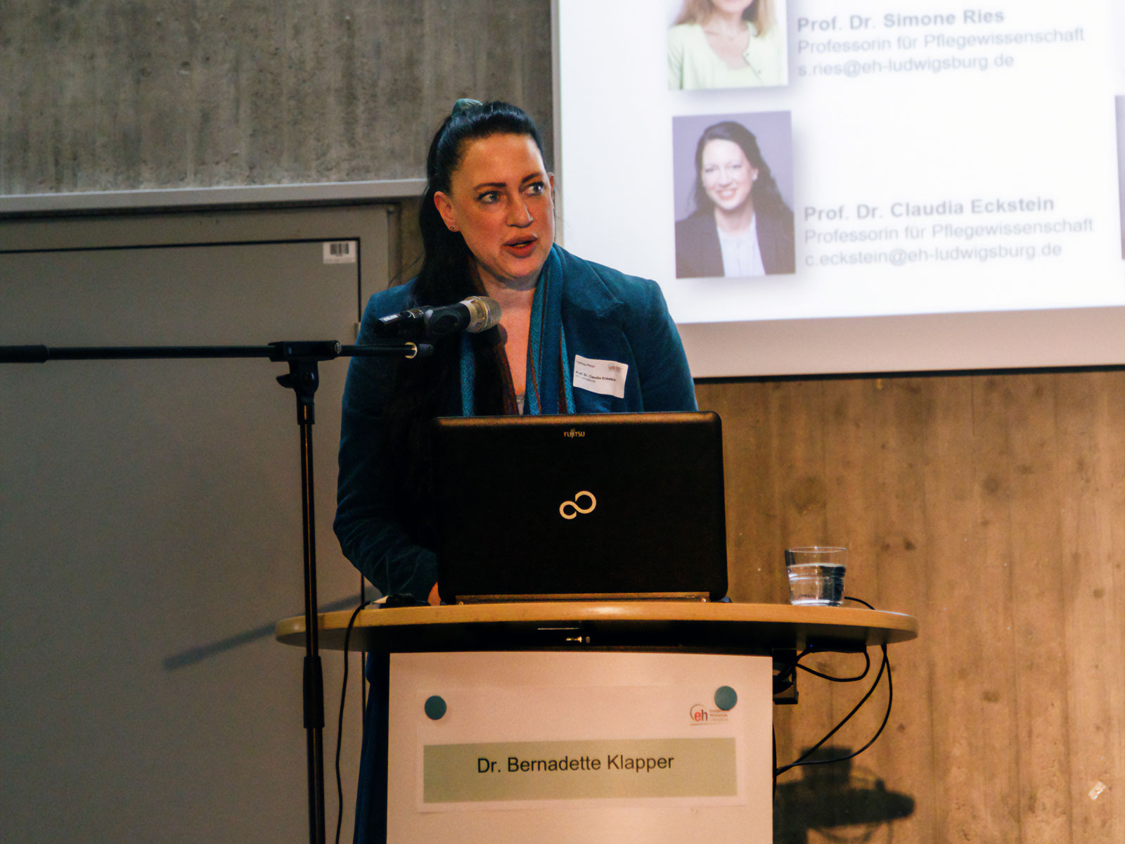 Diese Rahmenbedingungen wurden am Fachtag kritisch beleuchtet, insbesondere aber konstruktiv weitergedacht. Nach den Grußworten durch Prof. Dr. Andrea Dietzsch, Rektorin der Evangelischen Hochschule Ludwigsburg, erhielten die 100 Teilnehmenden fundamentale berufspolitische Ein- und Ausblicke durch die Keynote-Sprecherin Dr. Bernadette Klapper, Bundesgeschäftsführerin des Deutschen Berufsverbandes für Pflegeberufe. Weitere hochkarätige Referent:innen zeigten die Verantwortung von Hochschule und Politik sowie die erforderlichen Kompetenzen und Perspektiven auf. Im Weiteren wurden äußerst ermutigende und innovative Best Practice Projekte aus der Pflegepraxis vorgestellt. Die von Aufbruchsstimmung getönte Botschaft war unmissverständlich: Diakonische Einrichtungen „machen sich auf den Weg“, akademisch qualifizierten Pflegenden Perspektiven zu bieten und damit auch die Versorgung in der ambulanten und stationären Langzeitpflege zu verbessern. Ferner stellte eine „Community Health Nurse“ (CHN) ihr Arbeitsgebiet vor. Diese bislang noch wenig etablierte akademische Pflegerolle deckt ein breites Spektrum der kommunalen öffentlichen Gesundheitsversorgung ab. Sie stellt ein Bindeglied zwischen zu pflegenden Personen, deren Angehörigen, Gesundheitszentren sowie Pflege- und sozialen Diensten dar. Der abschließende Vortrag stellte das Lernen in der Pflegepraxis mit dem praxisnahen Lernen im Skillslab („klinisches Lernlabor“) gegenüber. Zudem wurden gemeinsame Lernarrangements von Fach- und Hochschule angedacht, die auf die Teamarbeit mit komplementären Aufgaben vorbereiten. Auf alle Vorträge folgten rege Diskussionen, die zeigten, dass die Etablierung von akademisch qualifizierten Fachpersonen in der ambulanten und stationären Langzeitpflege längst überfällig ist. Einigkeit herrschte bei Referent:innen und Teilnehmenden darüber, dass die alten, behinderten, kranken und auf Hilfe angewiesenen Menschen es uns wert sein müssen, die bestmöglichste Versorgung von fach- und hochschulischen Pflegefachpersonen zu erhalten.